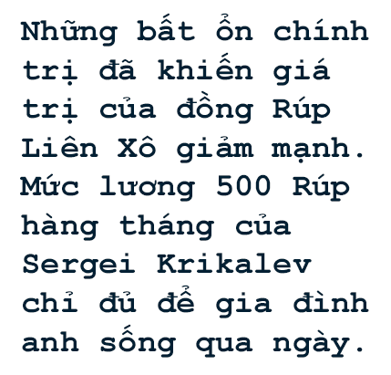 Những bất ổn chính trị đã khiến giá trị của đồng Rúp Liên Xô giảm mạnh. Mức lương 500 Rúp hàng tháng của Sergei Krikalev chỉ đủ để gia đình anh sống qua ngày. Cơ quan vũ trụ cũng đấu tranh để gửi nhu yếu phẩm cho anh.