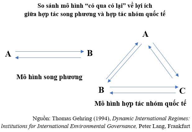 Thứ nhất, các nguyên tắc, thông lệ, quy tắc và quy trình của hợp tác nhóm quốc tế sẽ tạo ra khuôn khổ và điều kiện để các nước “có qua có lại” trong hợp tác, giúp các thành viên trong hợp tác nhóm quốc tế kết nối lợi ích với nhau thông qua tạo sự liên thông giữa các lĩnh vực, các vấn đề mà các thành viên có lợi ích. Không gian để đánh đổi lợi ích sẽ linh hoạt hơn vì sự thỏa hiệp trong vấn đề này sẽ mang lại lợi ích trong vấn đề khác. Trong hợp tác nhóm quốc tế, việc “có đi có lại” về lợi ích mang tính đan xen giữa các thành viên thay vì là sự đánh đổi trực tiếp giữa hai thành viên với nhau.[13] Từ đó gia tăng khả năng một thành viên sẵn sàng hơn để thỏa hiệp lợi ích trong một tình huống, một vấn đề cụ thể do việc duy trì tham vấn, trao đổi, đàm phán theo các nguyên tắc, thông lệ và quy tắc đã có sẽ bảo đảm cho thành viên đó được “bù đắp” về lợi ích trong tình huống của tương lai hay trong các vấn đề cụ thể khác. Từ góc độ này, có thể thấy về lâu dài và tổng thể, tiến trình hợp tác nhóm quốc tế sẽ thúc đẩy sự cân bằng về lợi ích giữa các thành viên và nâng cao hiệu quả hợp tác. Hình thức hợp tác này tạo điều kiện để các nước có thể hợp tác trong lĩnh vực cùng có lợi, cùng chia sẻ giá trị, lợi ích mặc dù giữa các thành viên có thể xung đột lợi ích trong một số lĩnh vực khác.