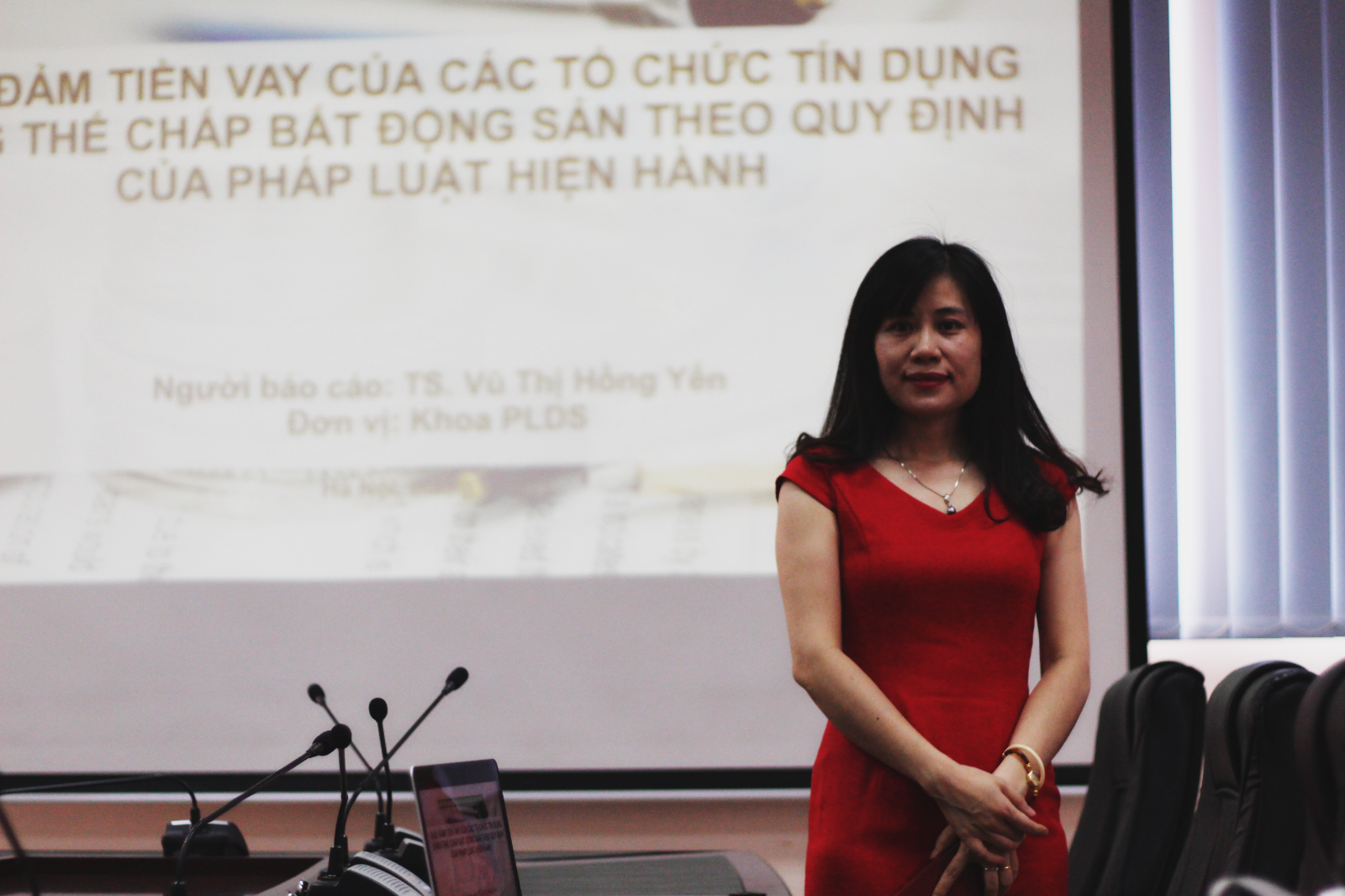 Tại buổi nghiệm thu, TS. Vũ Thị Hồng Yến đã báo cáo mục tiêu, nhiệm vụ cũng như các kết quả nghiên cứu đã đạt được của nhóm tác giả. Theo đó, đề tài tập trung vào các nội dung sau: Phân tích những vấn đề lý luận về bảo đảm tiền vay bằng bất động sản; Giới thiệu hệ thống những quy định pháp luật hiện hành: Bộ luật Dân sự năm 2015, Kinh doanh Bất động sản năm 2014, Luật Nhà ở năm 2014, Luật đất đai năm 2013 và các Nghị định, các thông tư, thông tư liên tịch mới được ban hành điều chỉnh quan hệ bảo đảm bằng bất động sản; Đánh giá thực trạng các quy định của pháp luật và thực tiễn áp dụng pháp luật về bảo đảm tiền vay bằng bất động sản; Chỉ ra những rủi ro pháp lý khi xác lập thực hiện hợp đồng bảo đảm bằng bất động sản và các giải pháp phòng ngừa; Đề xuất các giải pháp hoàn thiện pháp luật và cơ chế áp dụng pháp luật về bảo đảm tiền vay bằng thế chấp bất động sản của các tổ chức tín dụng theo những quy định mới của pháp luật.