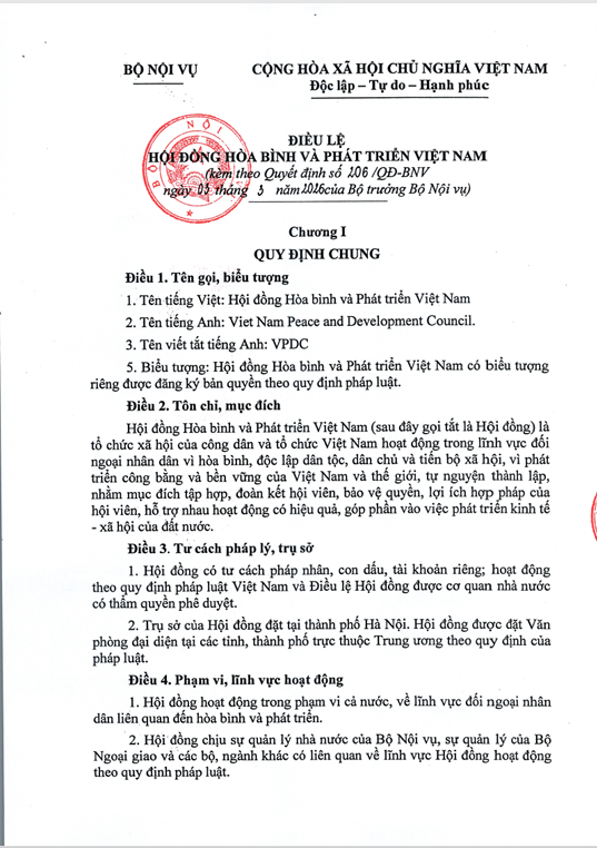 QUY ĐỊNH CHUNG Điều 1. Tên gọi, biểu tượng 1. Tên tiếng Việt: Hội đồng Hòa bình và Phát triển Việt Nam 2. Tên tiếng Anh: Viet Nam Peace and Development Council. 3. Tên viết tắt tiếng Anh: VPDC 5. Biểu tượng: Hội đồng Hòa bình và Phát triển Việt Nam có biểu tượng riêng được đăng ký bản quyền theo quy định pháp luật. Điều 2. Tôn chỉ, mục đích Hội đồng Hòa bình và Phát triển Việt Nam (sau đây gọi tắt là Hội đồng) là tổ chức xã hội của công dân và tổ chức Việt Nam hoạt động trong lĩnh vực đối ngoại nhân dân vì hòa bình, độc lập dân tộc, dân chủ và tiến bộ xã hội, vì phát triển công bằng và bền vững của Việt Nam và thế giới, tự nguyện thành lập, nhằm mục đích tập hợp, đoàn kết hội viên, bảo vệ quyền, lợi ích hợp pháp của hội viên, hỗ trợ nhau hoạt động có hiệu quả, góp phần vào việc phát triển kinh tế - xã hội của đất nước. Điều 3. Tư cách pháp lý, trụ sở 1. Hội đồng có tư cách pháp nhân, con dấu, tài khoản riêng; hoạt động theo quy định pháp luật Việt Nam và Điều lệ Hội đồng được cơ quan nhà nước có thẩm quyền phê duyệt. 2. Trụ sở của Hội đồng đặt tại thành phố Hà Nội. Hội đồng được đặt Văn phòng đại diện tại các tỉnh, thành phố trực thuộc Trung ương theo quy định của pháp luật. Điều 4. Phạm vi, lĩnh vực hoạt động 1. Hội đồng hoạt động trong phạm vi cả nước, về lĩnh vực đối ngoại nhân dân liên quan đến hòa bình và phát triển. 2. Hội đồng chịu sự quản lý nhà nước của Bộ Nội vụ, sự quản lý của Bộ Ngoại giao và các bộ, ngành khác có liên quan về lĩnh vực Hội đồng hoạt động theo quy định pháp luật. Điều 5. Nguyên tắc tổ chức, hoạt động 1. Tự nguyện, tự quản. 2. Dân chủ, bình đẳng, công khai, minh bạch. 3. Tự bảo đảm kinh phí hoạt động. 4. Không vì mục đích lợi nhuận. 5. Tuân thủ Hiến pháp, pháp luật và Điều lệ Hội đồng. Chương II QUYỀN, NGHĨA VỤ, TRÁCH NHIỆM CỦA HỘI ĐỒNG Điều 6. Quyền của Hội đồng 1. Tổ chức, hoạt động theo Điều lệ Hội đồng đã được phê duyệt. 2. Tuyên truyền tôn chỉ, mục đích hoạt động của Hội đồng. Được cung cấp thông tin, phổ biến đường lối, chủ trương của Đảng, chính sách, pháp luật của Nhà nước. 3. Đại diện cho hội viên trong mối quan hệ đối nội, đối ngoại có liên quan đến quyền và nghĩa vụ của Hội đồng. 4. Bảo vệ quyền, lợi ích hợp pháp của Hội đồng, hội viên và cộng đồng phù hợp với tôn chỉ, mục đích của Hội đồng. 5. Tổ chức, phối hợp hoạt động giữa các hội viên vì lợi ích chung của Hội đồng. 6. Phổ biến, bồi dưỡng kiến thức cho hội viên, cung cấp thông tin cần thiết cho hội viên theo quy định của pháp luật. 7. Tham gia các chương trình, dự án, đề tài, nhiệm vụ nghiên cứu khoa học và phát triển công nghệ, các hoạt động tư vấn, phản biện chính sách theo đề nghị của cơ quan nhà nước liên quan đến hòa bình và phát triển; tham gia cung cấp dịch vụ công về các vấn đề thuộc lĩnh vực hoạt động của Hội đồng theo quy định của pháp luật. 8. Hội đồng được đặt chi nhánh hoặc văn phòng đại diện tại tỉnh, thành phố trực thuộc trung ương khác với nơi đặt trụ sở của Hội đồng và có thể đặt văn phòng đại diện tại nước ngoài theo quy định pháp luật. 9. Thành lập và quản lý chặt chẽ tổ chức thuộc Hội đồng theo quy định của pháp luật và Điều lệ Hội đồng phù hợp với tôn chỉ, mục đích và lĩnh vực hoạt động của Hội đồng. 10. Được tham gia ý kiến xây dựng cơ chế, chính sách liên quan trực tiếp đến chức năng, nhiệm vụ, quyền hạn và lĩnh vực hoạt động của Hội đồng. Kiến nghị với cơ quan nhà nước có thẩm quyền đối với các vấn đề liên quan tới sự phát triển Hội đồng và lĩnh vực Hội đồng hoạt động. Được tham gia tổ chức đào tạo, bồi dưỡng, tổ chức các hoạt động dịch vụ khác theo quy định của pháp luật. 11. Phối hợp với cơ quan, tổ chức có liên quan để thực hiện nhiệm vụ của Hội đồng. 12. Thu hội phí của hội viên và hoạt động tạo nguồn thu từ hoạt động kinh doanh, dịch vụ theo quy định của pháp luật để tự trang trải về kinh phí hoạt động. 13. Được tiếp nhận, quản lý và sử dụng các nguồn tài trợ, viện trợ hợp pháp của các tổ chức, cá nhân trong và ngoài nước theo quy định của pháp luật gắn với tôn chỉ, mục đích hoạt động, chức năng, nhiệm vụ của Hội đồng. 14. Được Nhà nước hỗ trợ kinh phí đối với những hoạt động gắn với nhiệm vụ do Đảng, Nhà nước giao (nếu có). 15. Được gia nhập các tổ chức quốc tế tương ứng và ký kết, thực hiện thỏa thuận quốc tế theo quy định của pháp luật sau khi có ý kiến thống nhất của cấp có thẩm quyền và các cơ quan quản lý nhà nước khác có liên quan về việc gia nhập tổ chức quốc tế tương ứng, ký kết, thực hiện thoả thuận quốc tế. Phối h