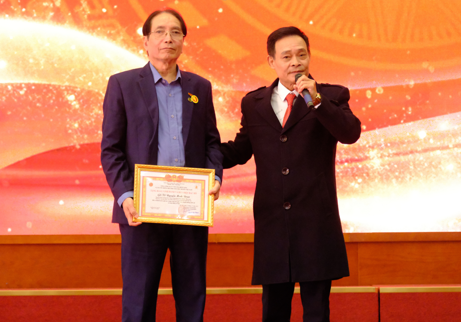 GS.TS. Nguyễn Minh Đoan - Nguyên Phó trưởng khoa Khoa Pháp luật Hành chính - Nhà nước, Nguyên Chủ tịch Hội Cựu chiến binh Trường Đại học Luật Hà Nội vinh dự nhận Bằng vinh danh và Huy hiệu Bác Hồ.