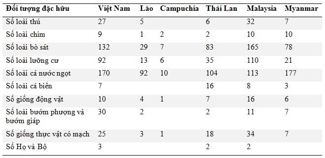 Bảng 1. Thống kê tính đặc hữu về động, thực vật ở Việt Nam so sánh với các quốc gia lân cận.