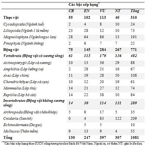 Bảng 2. Thống kế số lượng loài động, thực vật đang có nguy cơ tuyệt chủng và đã tuyệt chủng theo Sách đỏ Việt Nam.