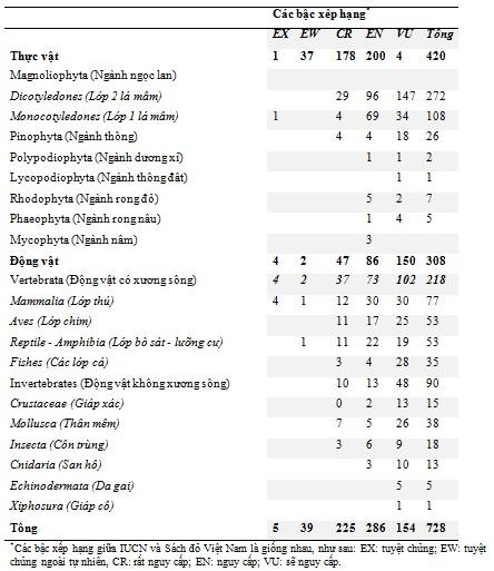 Không chỉ vậy, số lượng các loài có nguy cơ tuyệt chủng toàn cầu có phân bố ở Việt Nam hiện cũng rất nhiều. Theo dữ liệu từ Danh lục đỏ IUCN năm 2020 [19], tổng cộng có 6.640 loài sinh vật đã được đánh giá, trong đó có 1.081 loài (gồm 771 loài động vật và 310 loài thực vật) đang có nguy cơ tuyệt chủng, chiếm 16,28% tổng số loài đã được đánh giá (bảng 3). Con số này đã tăng hơn so với tỷ lệ 13% ở năm 2012 [16]. Như vậy có thể thấy rằng số lượng loài động, thực vật cần được bảo tồn ở Việt Nam là rất lớn và có thể xem đây là một thách thức không hề nhỏ đối với công tác bảo tồn đa dạng sinh học ở Việt Nam.